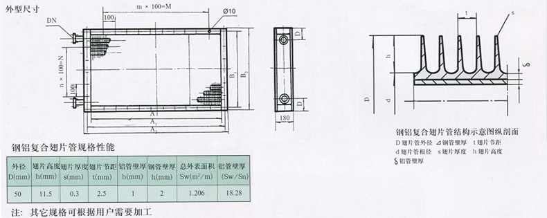 鋼鋁復(fù)合翅片管觀格性能見表。
