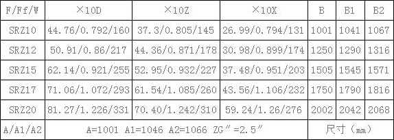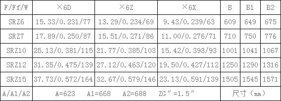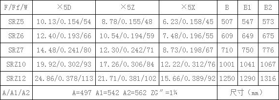 表4、SRZ空氣熱交換器(散熱器)散熱面積F(m2),通風(fēng)凈截面積Ff(m2),參考重量W(Kg),有關(guān)尺寸(mm)一覽表