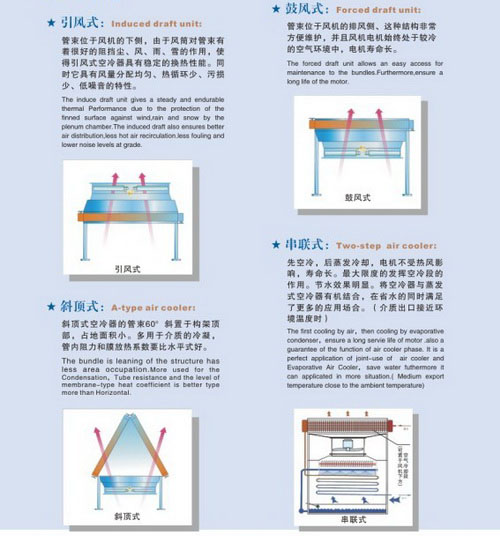 空氣冷卻器是以環(huán)境空氣作為冷卻介質(zhì),對管內(nèi)高溫流體進(jìn)行冷卻或冷凝的設(shè)備,它具有不需要水源,適用于高溫、高壓的工藝條件,使用壽命長,運(yùn)轉(zhuǎn)費(fèi)用低等優(yōu)點(diǎn),廣泛應(yīng)用于石油化工,煤化工,電站,冶金等行業(yè)。等隨著水資源和能源的匱乏以及環(huán)保意識的增強(qiáng),節(jié)水、節(jié)能、無污染的空氣冷卻器將會得到廣泛的應(yīng)用。
